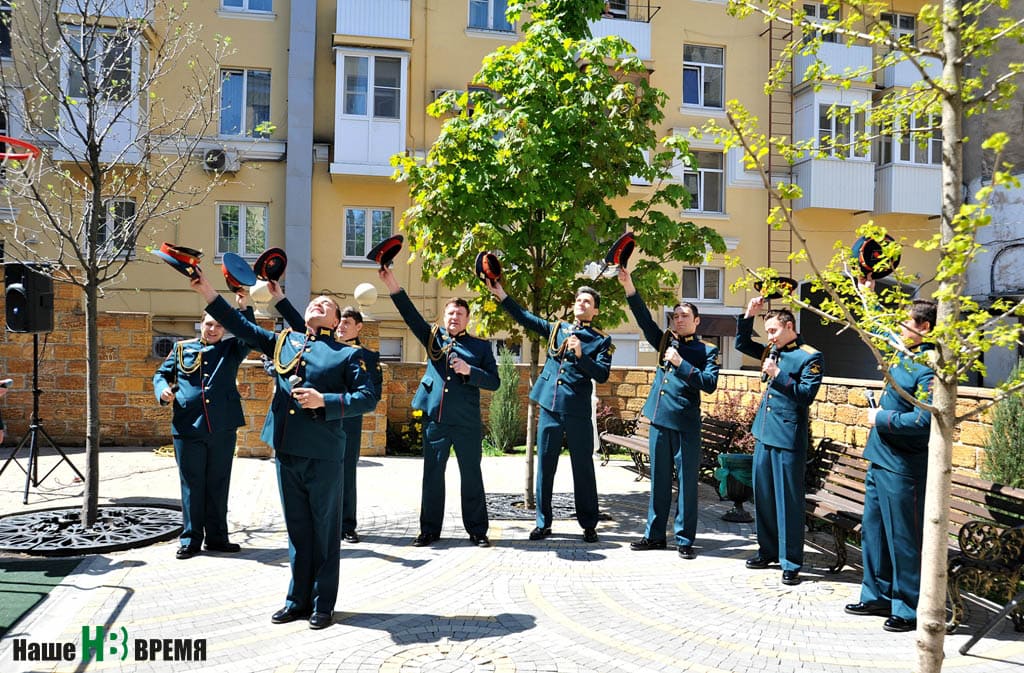 Военные артисты ЮВО исполнили несколько известных песен во дворе дома по проспекту Буденновский, 32 для живущих здесь ветеранов Великой Отечественной войны.