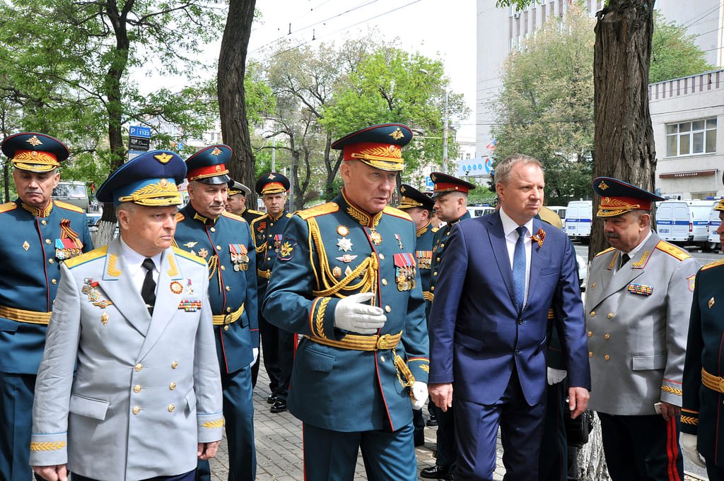 А 9 мая на Театральной площади руководство Донского региона и командование Южного военного округа возложили гирлянду Славы к мемориалу Воинам-освободителям.