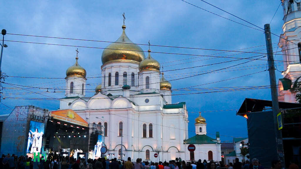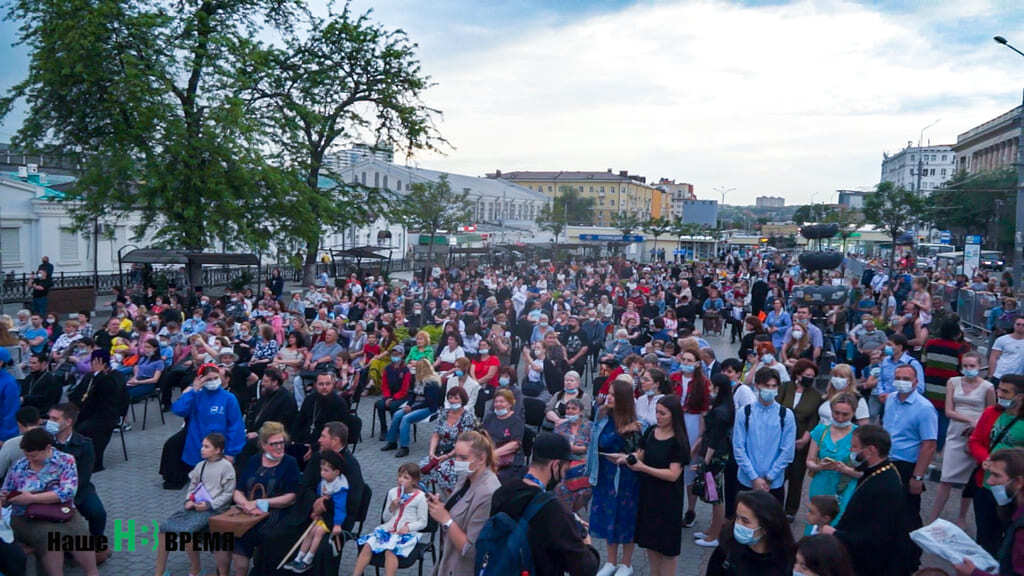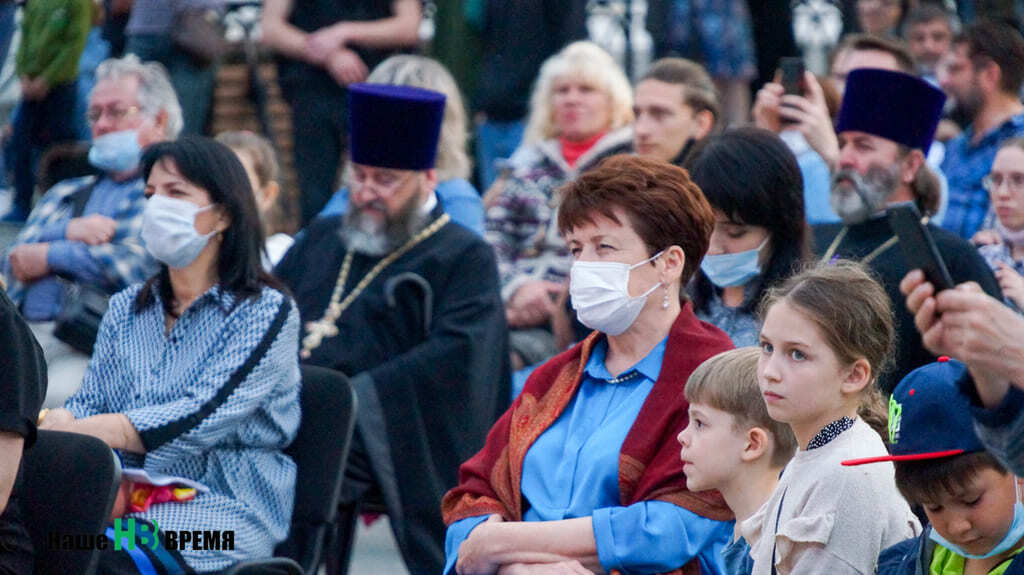 На этот раз противоэпидемические требования смягчили: перед сценой, установленной перед ростовским кафедральным собором, разместили в отдалении друг от друга около полутысячи зрительских мест. К традиционным мерам предосторожности перед массовым мероприятием — рамкам металлоискателей на входе и контролю со стороны сотрудников правопорядка — добавился и обязательный масочный режим.