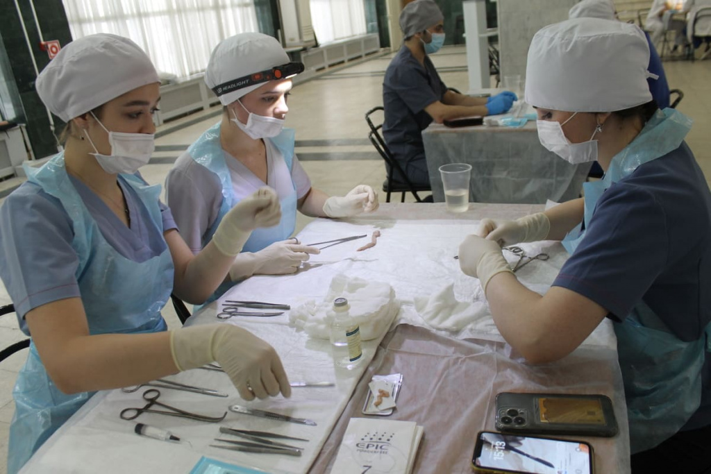 Как подготовились — проверили теперь на отборочном вузовском туре. В первый конкурсный день студенты выполняли, казалось, простые задания. Но они с подвохом — требуют виртуозного исполнения. Например, конкурс «Хирургическая косичка» — традиционный, но очень зажигательный: за 30 секунд необходимо под энергичную музыку связать как можно больше хирургических узлов. Судит конкурс аспирант кафедры хирургических болезней № 1 Никита Лукьянов: скрупулезно оценивает каждый шов, каждый стежок должен быть выполнен безошибочно.