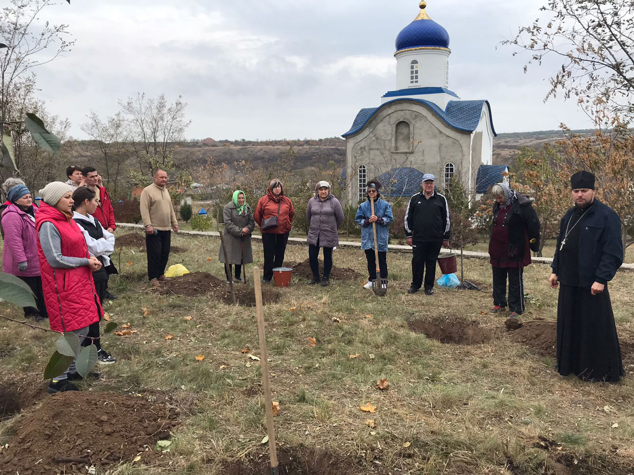 Настоятель местного храма отец Вадим благословил всех работников и сам принял активное участие в посадке. Н.Несмеянова испекла яблочный пирог, приготовила для всех чай. Все трудились с вдохновением – погореловцы, крутинцы, жители поселков Горняцкий, Синегорский, приехавшие из Белой Калитвы, Москвы.