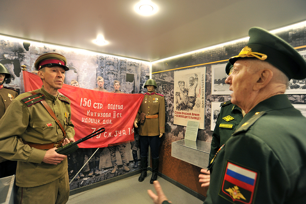 О победном мае 1945-го напоминают копия знамени Победы, плакаты военных лет и снимки. Военные фотографы запечатлели капитуляцию гитлеровцев, регулировщицу на улице взятого Берлина, парад Победы 24 июня 1945 года... На память можно взять номер газеты «Известия» за 9 мая 1945 года.