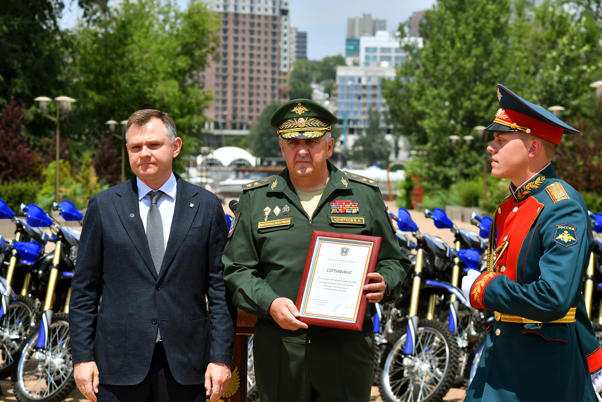 Сегодня в парке культуры и отдыха «Левобережный» донской столицы врио губернатора Ростовской области Юрий Слюсарь передал в рамках акции «СВОи приходят на помощь» 100 кроссовых мотоциклов командованию Южного военного округа. Эти мотоциклы отправятся в подразделения, выполняющие поставленные задачи в зоне проведения специальной военной операции.