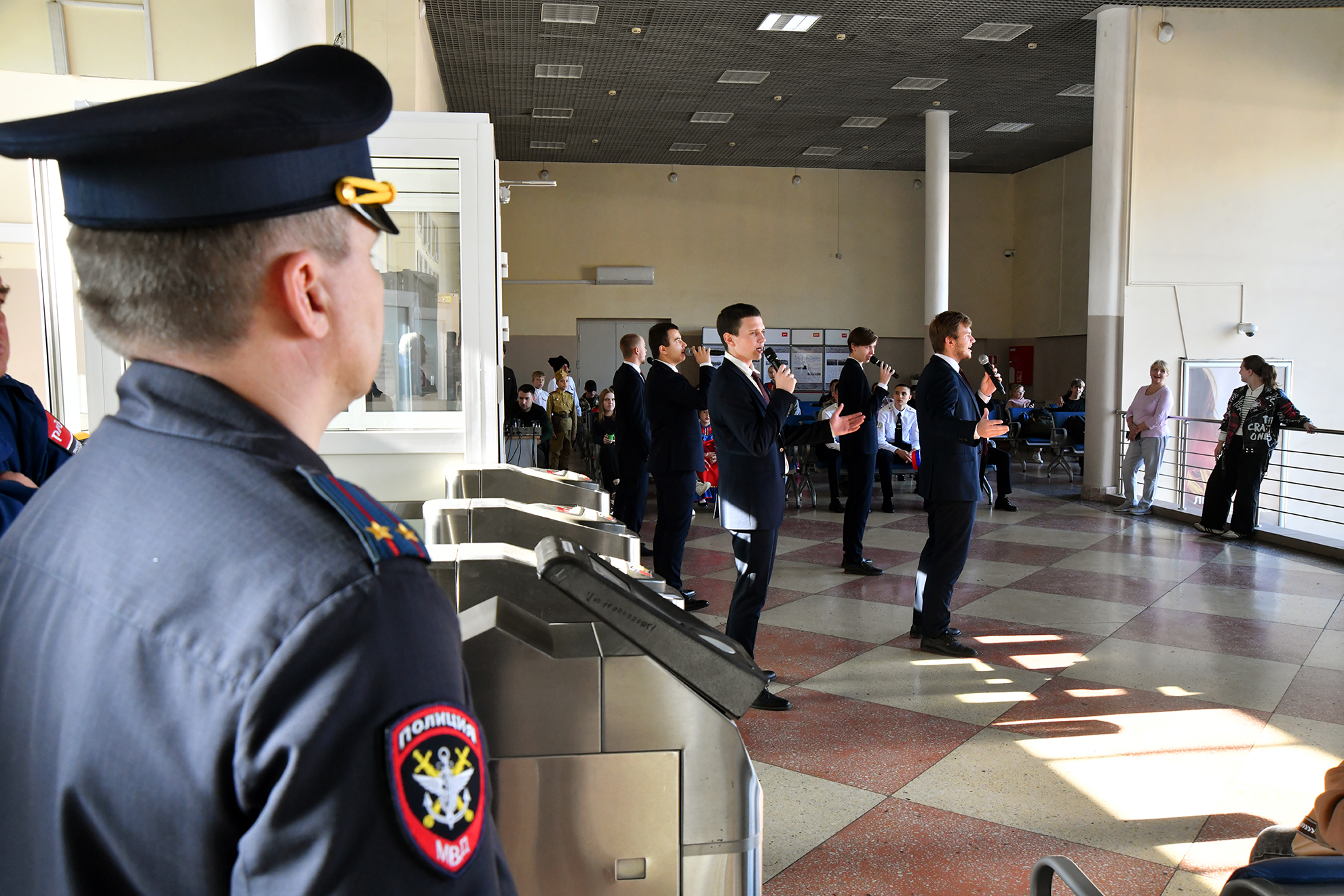 Чтобы привлечь в свои ряды новые кадры, сотрудники Управления на транспорте МВД России по Северо-Кавказскому федеральному округу провели на Ростовском пригородном железнодорожном вокзале необычную акцию – масштабный патриотический флешмоб с целью популяризации службы в органах внутренних дел. Началось все с концертной программы, в которой приняли участие творческие коллективы и солисты Дворца культуры железнодорожников и различных учебных заведений южной столицы страны. Для пассажиров и гостей вокзала прозвучали известные патриотические песни, создавшие праздничную и торжественную атмосферу.