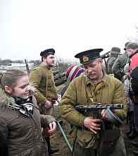 Перебежками по задымленным буеракам перебираются воины в форме Красной армии времен Великой Отечественной войны. Вот еще один взрыв — все пригнулись, и снова в бой. Из-за ближайшего рва выглядывает немецкий солдат, наставляет на красноармейцев указательные пальцы - и «тра-та-та!» «Это еще чего?!» — возмущаются его противники. Солдат поясняет, что экономит патроны. «Пау!» — громко кричит экипаж артиллерийской установки, символизируя взрыв снаряда. В нескольких метрах от этого действа два полицая с белыми нашивками поят горячим чаем замерзшую советскую медсестру.