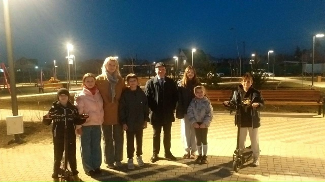 Уже стемнело, а на площадке вовсю гудели довольные ребятишки. Владимир Бартеньев подошёл, поговорил с ними. Их восторг и счастливые лица — лучший отчет о проделанной работе!
