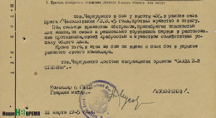 В бою, за который Чернушенко наградили орденом Славы III степени, наш земляк действовал смело и решительно. В наградном листе зафиксировано: под сильным вражеским обстрелом своей храбростью он обеспечил успех общего дела. В том же бою он спас своего раненого командира.