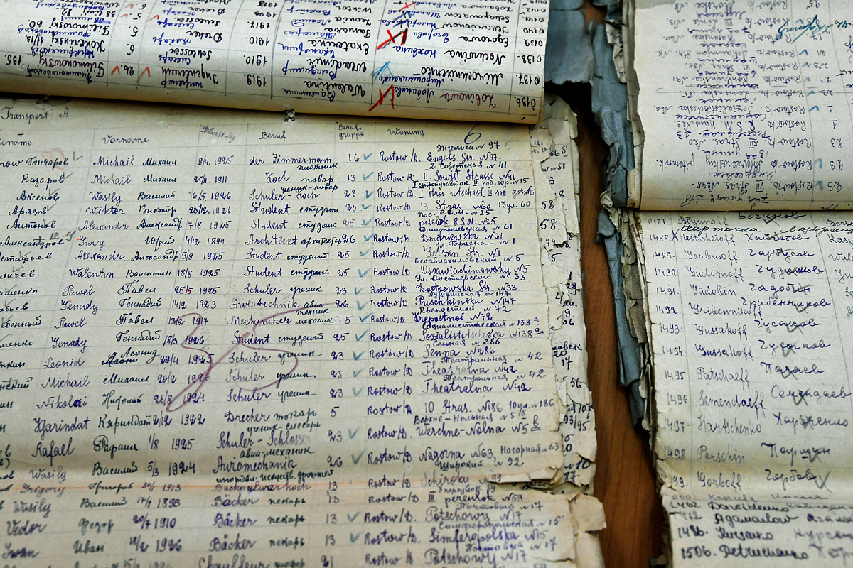 В период второй оккупации донской столицы здесь вели карточки учета на немецком языке. Помимо ФИО, года рождения и адреса проживания человека указывалась группа угона.