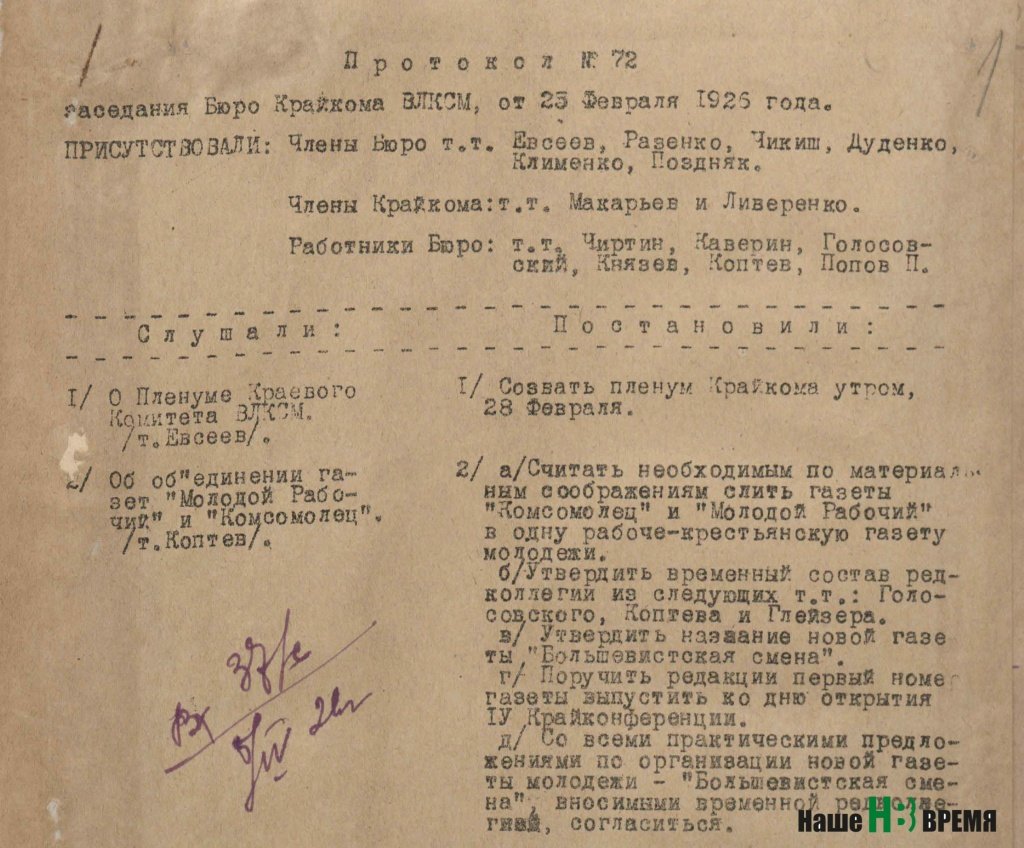 На проходившем 20-23 мая 1926 года краевом агитпропсовещании был заслушан доклад тов. Коптева (имена и отчества в документах того времени зачастую отсутствовали) о состоянии обновленной газеты.