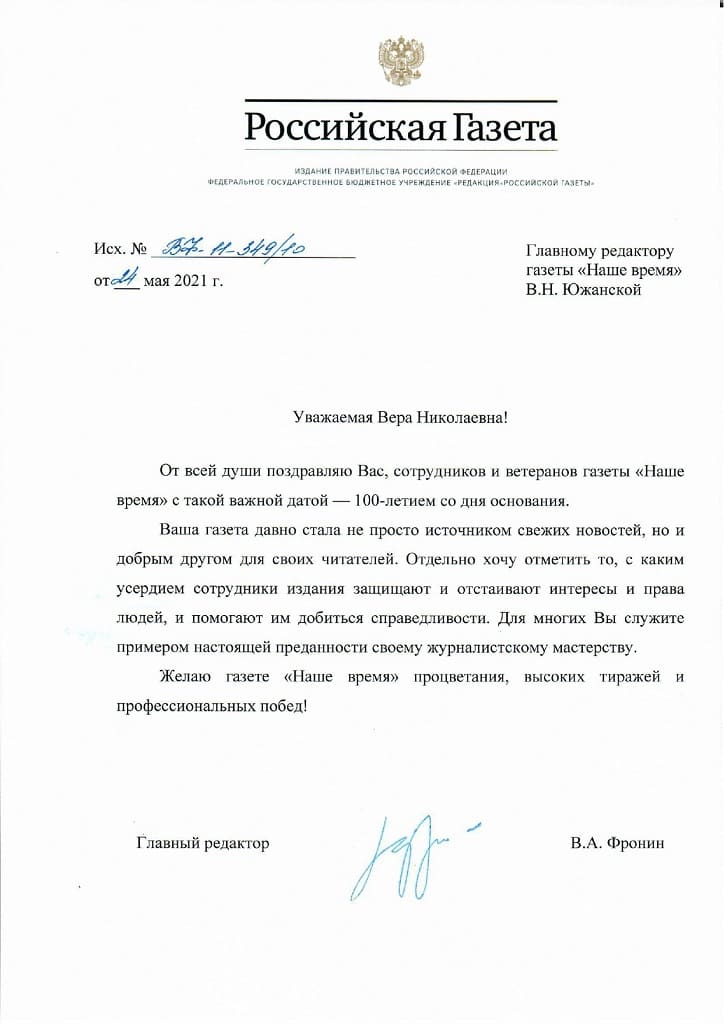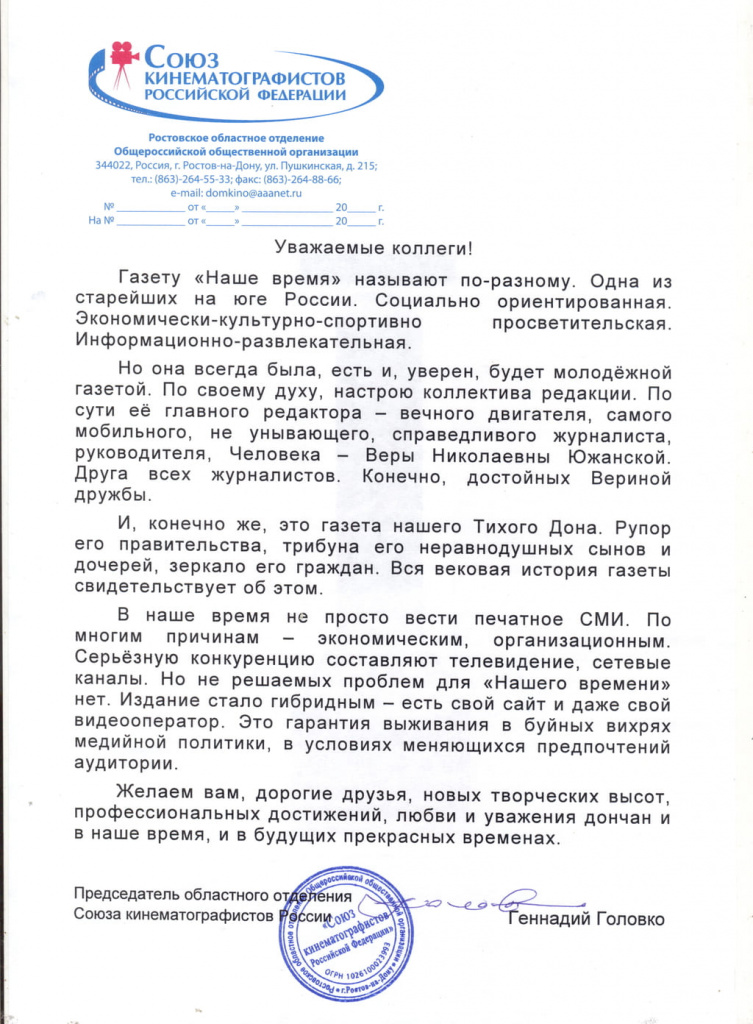 Уважаемая Вера Николаевна, от имени Российского Союза ветеранов поздравляю Вас и всех сотрудников со 100 летним юбилеем газеты "Наше время ". Желаю дальнейшего процветания газеты на очередное столетие, новых творческих успехов в доведении событий, происходящих в Ростовской области до читателей. Здоровья, счастья и благополучия всем сотрудникам на долгие годы.Постоянный подписчик газеты, член Президиума РСВ г.м. В.Чернобылов.