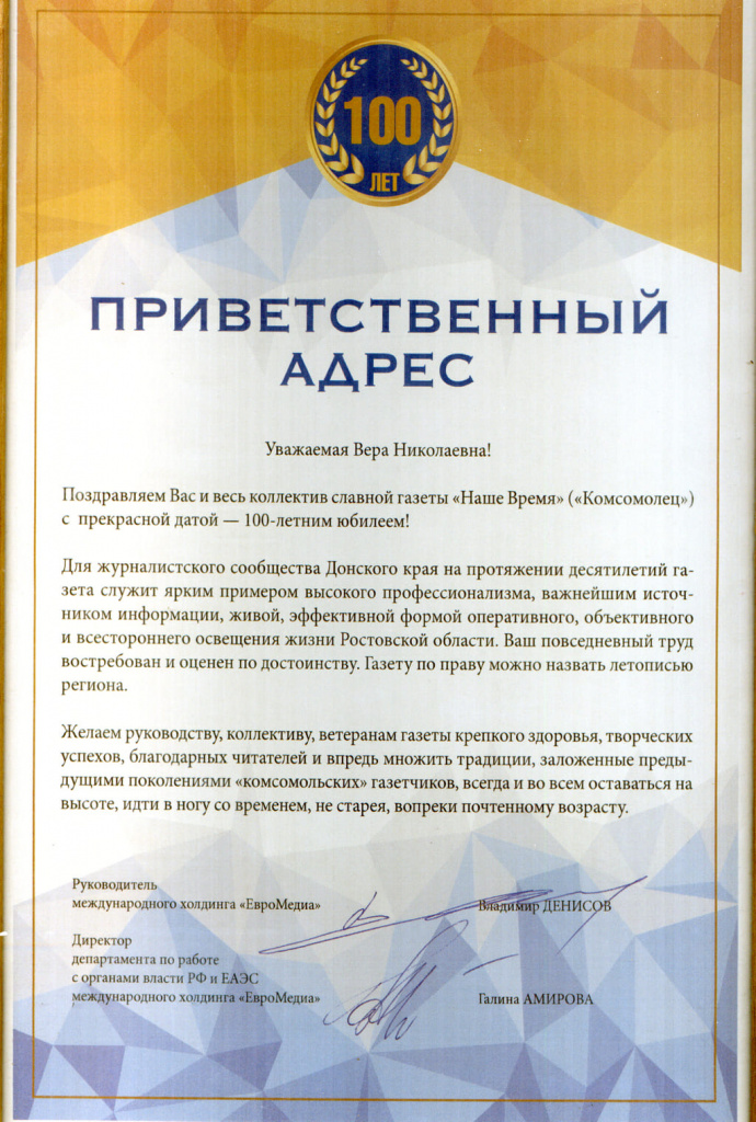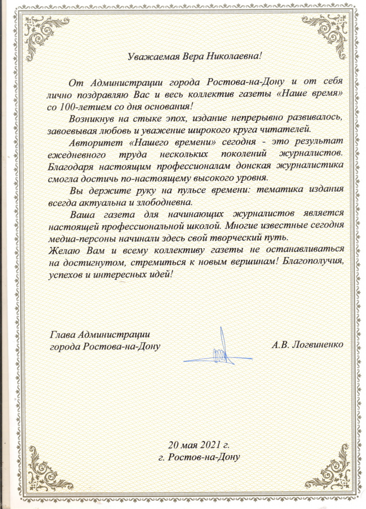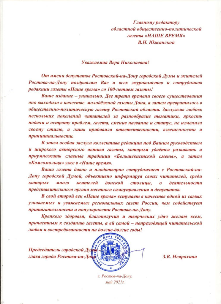 Уважаемая Вера Николаевна!От имени депутатов Ростовской-на-Дону городской Думы и жителей Ростова-на-Дону поздравляю Вас и всех журналистов и сотрудников редакции газеты «Наше время» со 100-летием газеты!