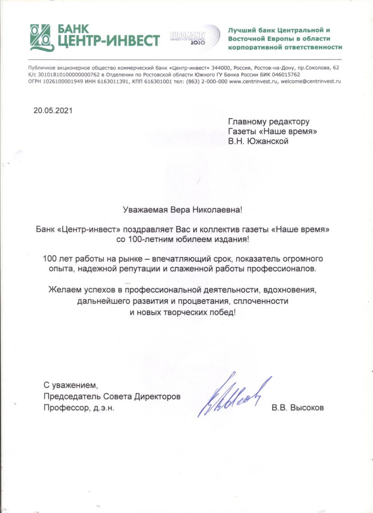 Уважаемая Вера Николаевна!Банк «Центр-инвест» поздравляет Вас и коллектив газеты «Наше время» со 100-летним юбилеем издания!