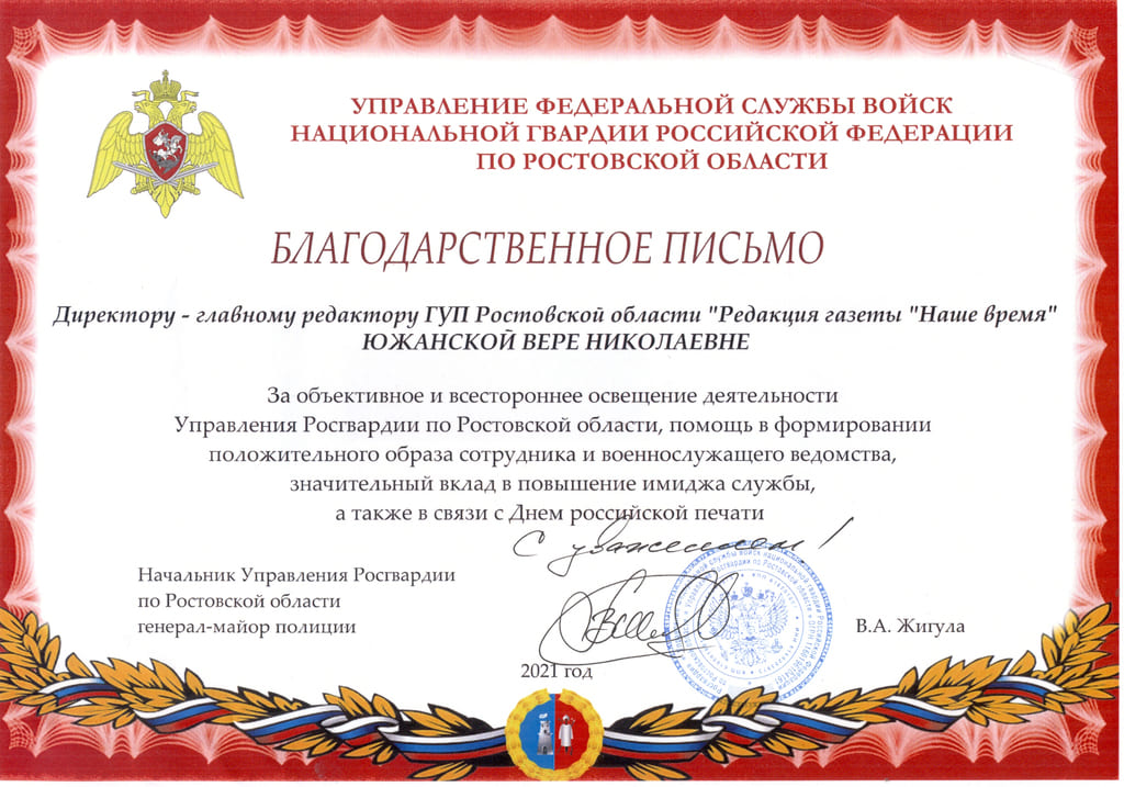 С уважением, генеральный директор И.И. Селедцов, главный редактор У.Н. Алфеева и коллектив издания «АиФ на Дону».