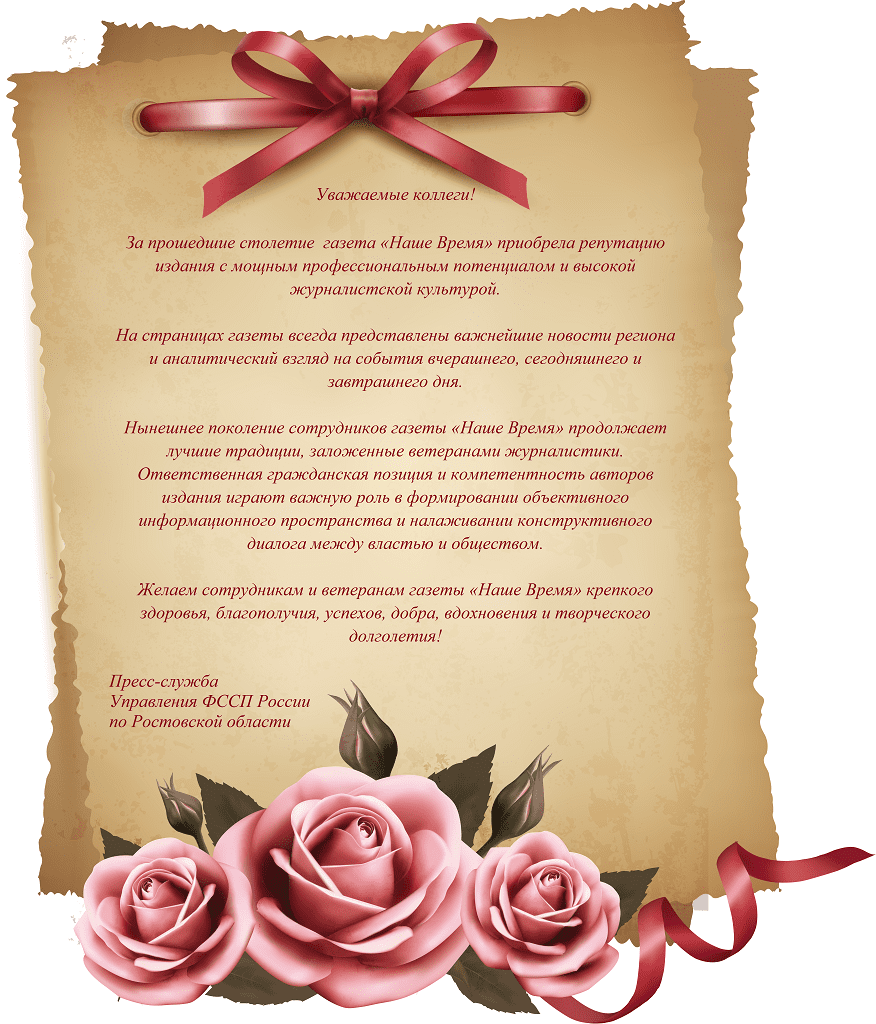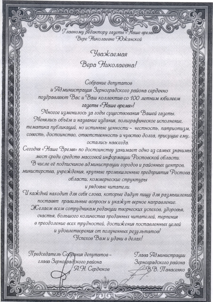 Собрание депутатов и Администрация Зерноградского района сердечно поздравляют Вас и Ваш коллектив со 100-летним юбилеем газеты «Наше время»!