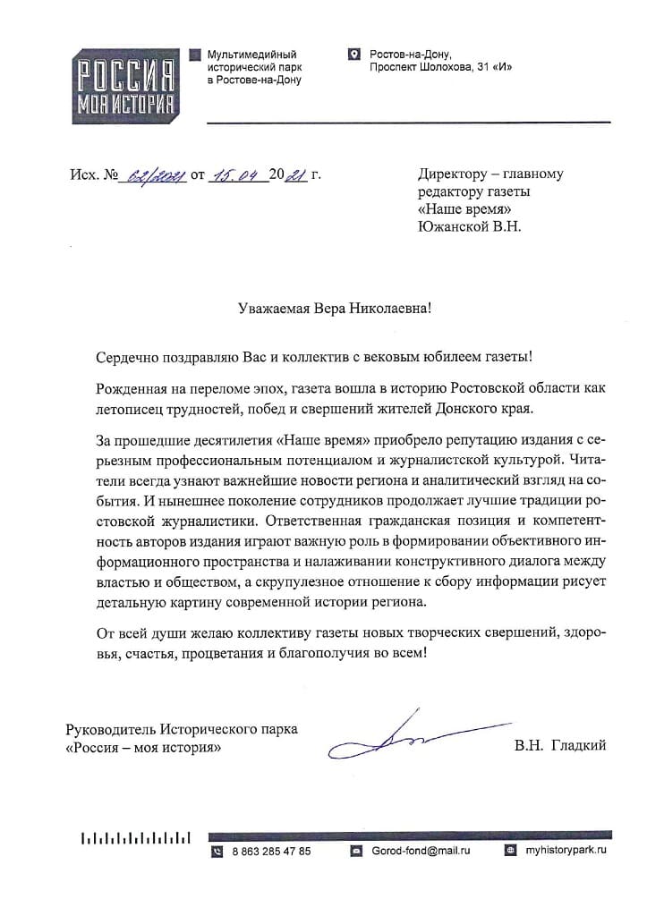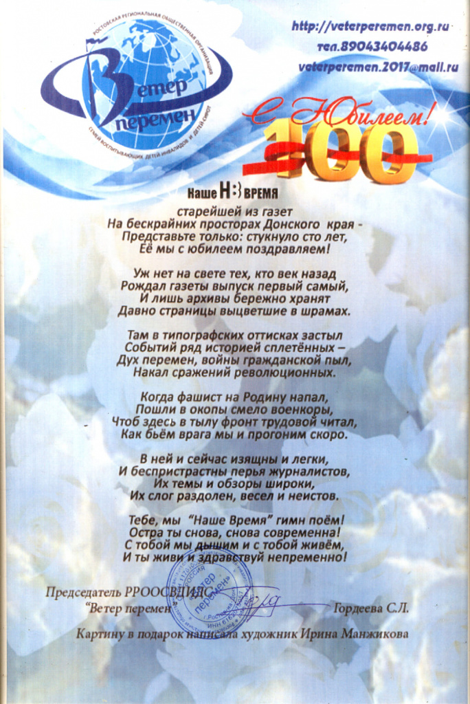 Вы всегда идете в ногу со временем, что позволяет «Нашему времени» быть признанным информационным центром, иметь свою постоянную аудиторию. Благодаря вашему изданию, затрагивающему все сферы жизнедеятельности Донского края, сегодня читатели узнают актуальную и достоверную информацию.