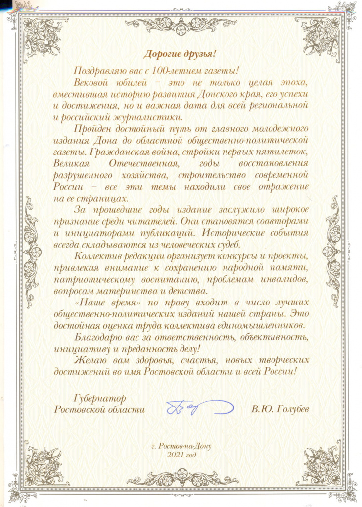 От Администрации города Ростова-на-Дону и от себя лично поздравляю Вас и весь коллектив газеты «Наше время» со 100-летием со дня основания!