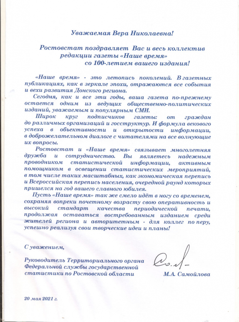 Уважаемая Вера Николаевна!Ростовстат поздравляет Вас и весь коллектив редакции газеты «Наше время»