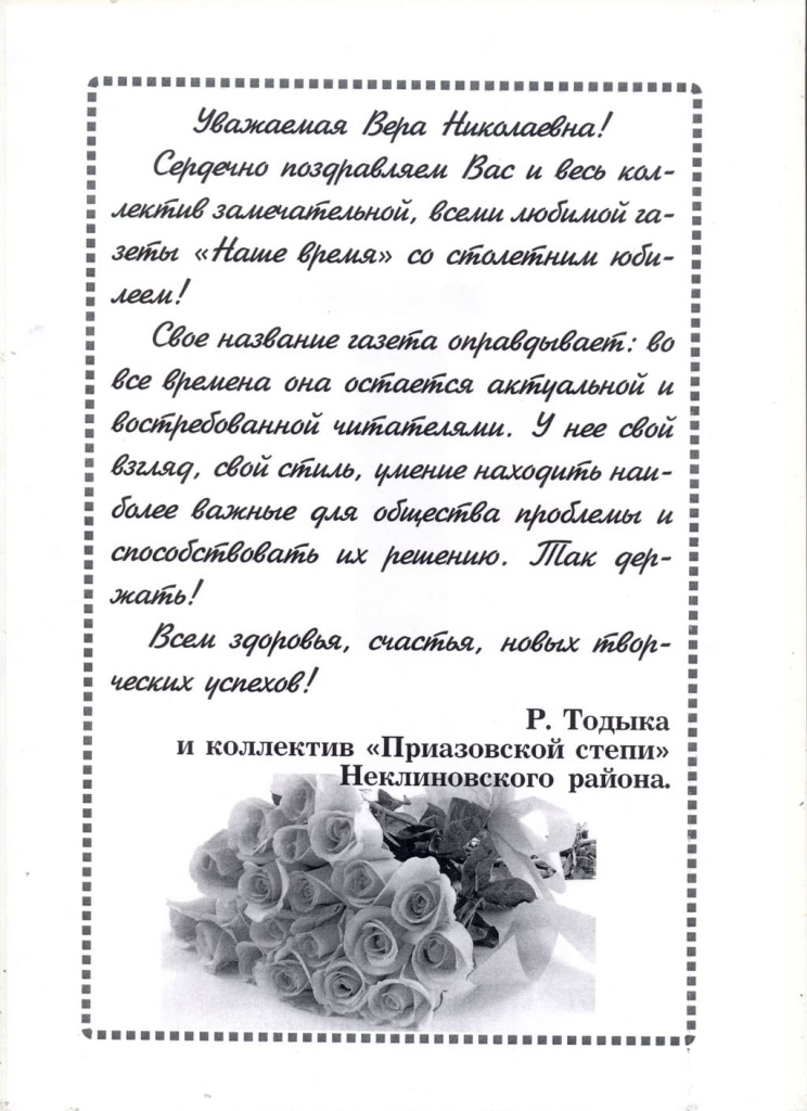 Уважаемая Вера Николаевна! Коллектив ремонтненского "Рассвета" поздравляет Вас и коллектив «Нашего времени» с замечательным юбилеем! Успехов всем вам творческих и личных, новых идей и воплотившихся планов. Будьте здоровы!