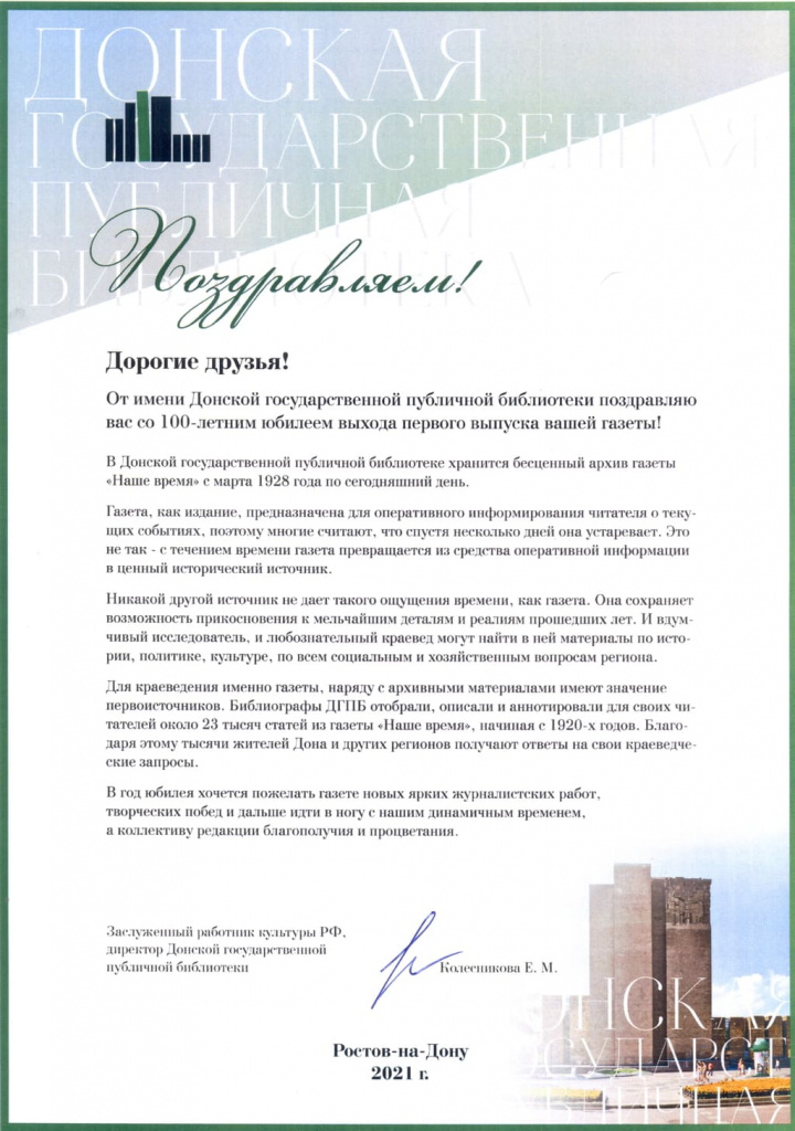 От имени Донской государственной публичной библиотеки поздравляю вас со 100-летним юбилеем выхода первого выпуска вашей газеты!