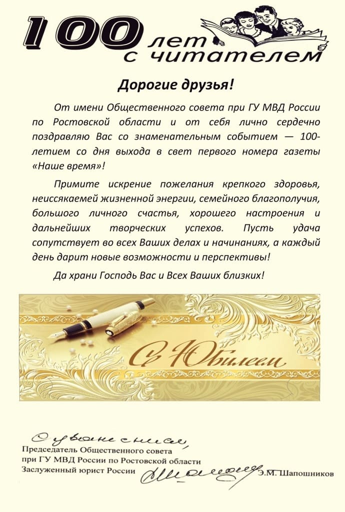 Первичная организация ГАИ-ГИБДД и общественная организация «ЮИД ДОНА» поздравляют коллектив газеты «Наше время» с таким значимым событием… Благодарим за долгие годы сотрудничества, информационную поддержку и желаем интересных материалов, новых подписчиков и благодарных читателей.