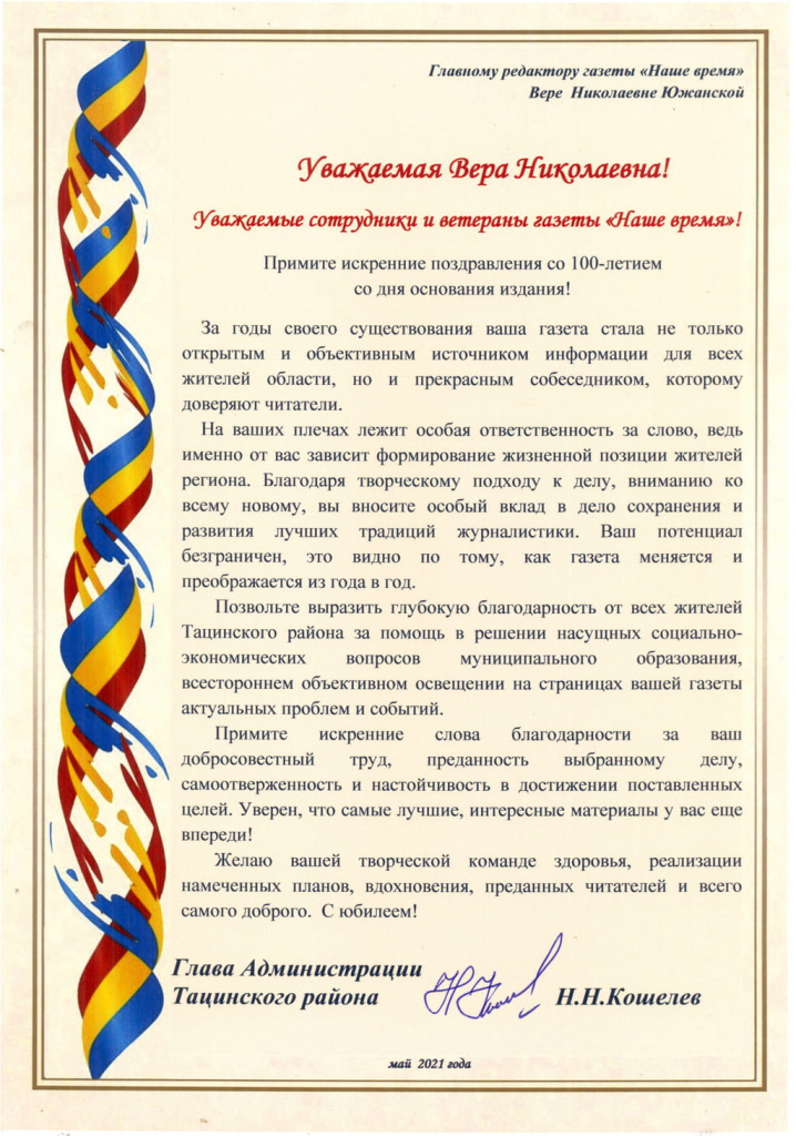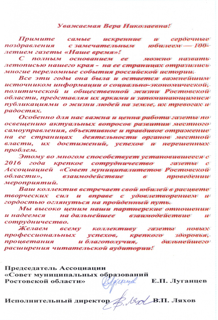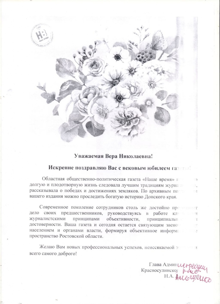 Уважаемая Вера Николаевна!Собрание депутатов и Администрация Зерноградского района сердечно поздравляют Вас и Ваш коллектив со 100-летним юбилеем газеты «Наше время»!