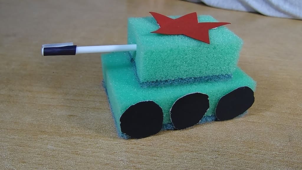 Для его изготовления понадобятся две прямоугольные губки (побольше и поменьше), клей, ножницы, черная краска, цветная бумага и ватная палочка.Приклеиваем губку поменьше посреди большой губки – получилась башня на корпусе. Делаем острыми ножницами дыру в «башне» и вставляем туда ватную палочку, предварительно смазав вставляемый конец клеем. Конец, что смотрит наружу, красим в черный цвет. Дальше вырезаем круги-колеса из черной бумаги и приклеиваем их по бокам корпуса. Танк готов.