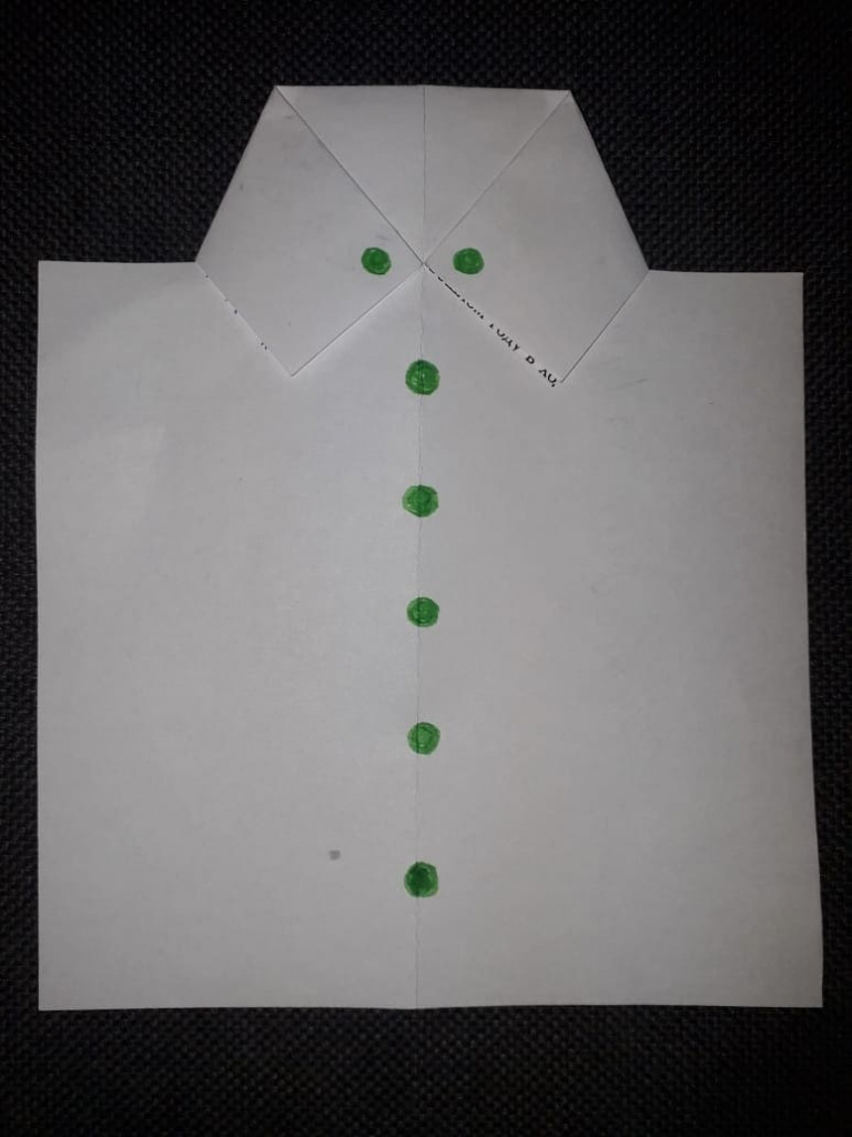 Берем лист бумаги поплотнее (можно альбомный) и делаем два небольших одинаковых надреза по бокам. Дальше с обоих концов заворачиваем лист бумаги к середине и приклеиваем – получилась рубашка с воротником. Рисуем пуговицы – рубаха готова.