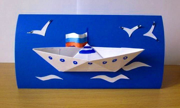 Такая открытка подойдет для любого мужчины: папы, дедушки, дяди. Взрослый сделает из бумаги самолет или кораблик, даст малышу белый или голубой лист бумаги. Ребенку останется только приклеить кораблик или самолет к бумаге и еще нарисовать облака или волны, возможно, солнышко.