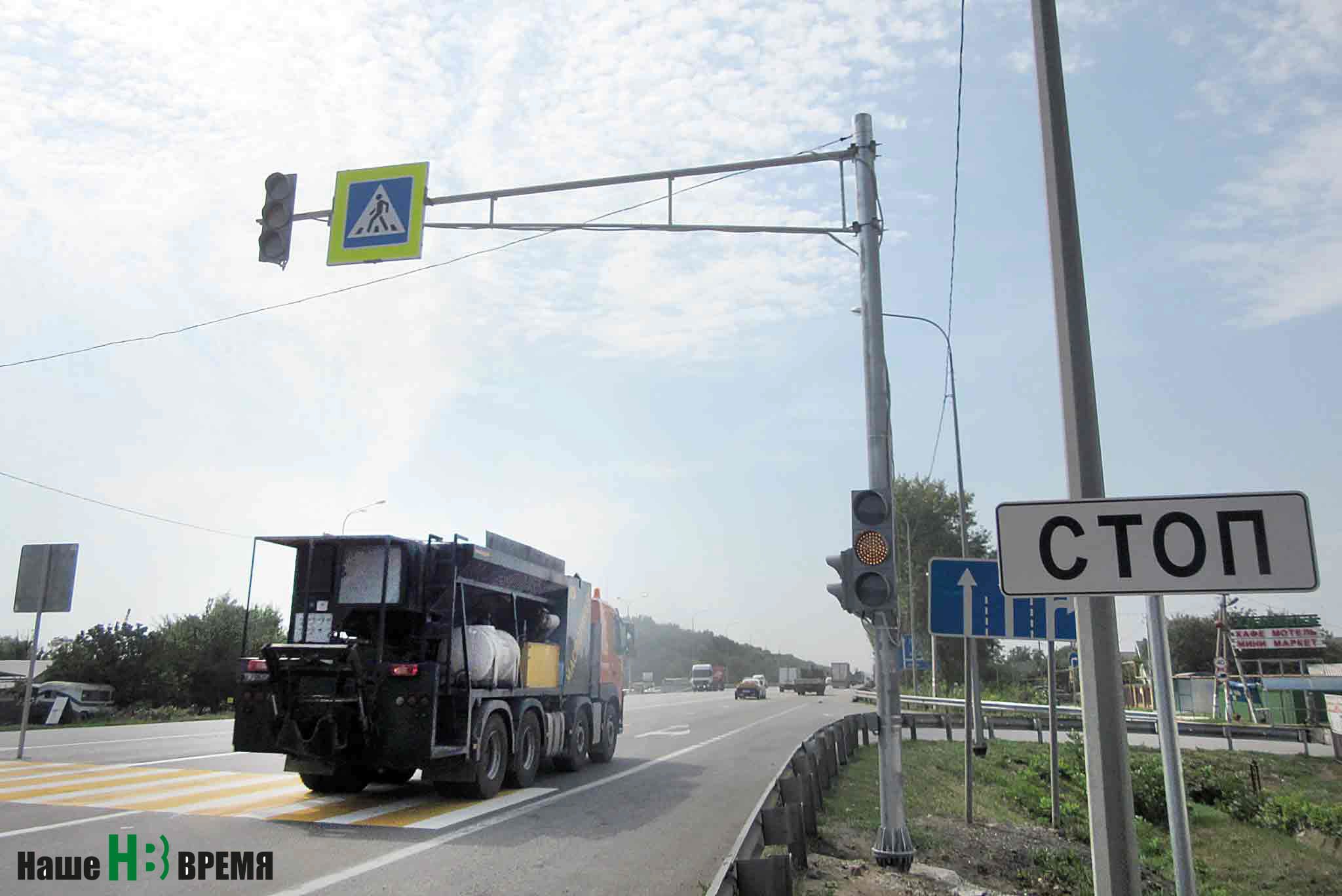 Разметку – ярко-желтую, которую видно издалека – между хуторами нарисовали еще в первой декаде августа. Тогда же установили и светофоры. Но пока они включили только мигающий желтый сигнал, и народ переходит трассу с опаской.