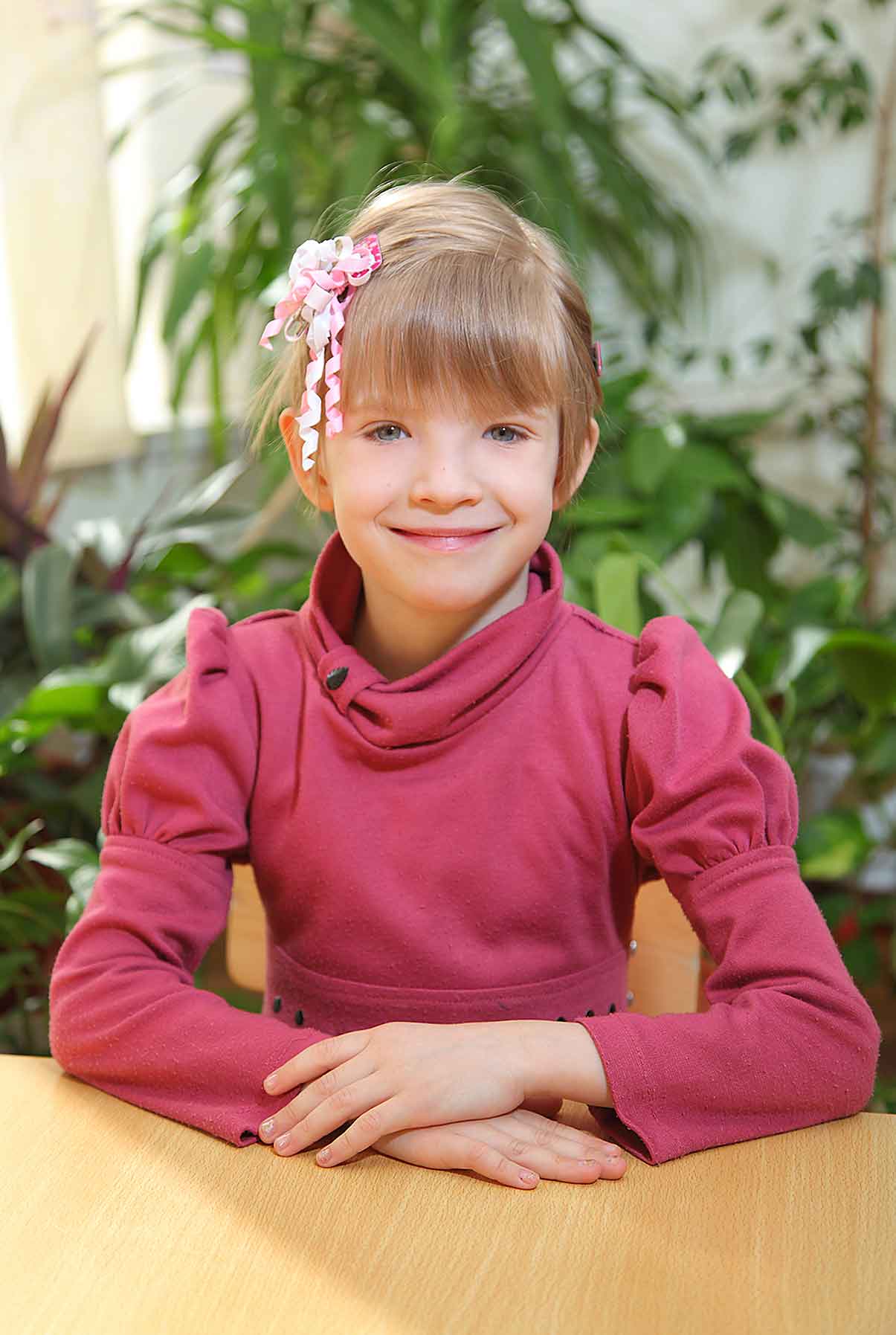 .Спокойная, очень застенчивая, ласковая. Старается ни в чем не отставать от сверстников, переживает из-за неудач, всегда спешит на помощь малышам.Любыми видами деятельности занимается с рвением, хотя и не всегда успешно. Любимые игрушки: куклы, развивающие игры. Любимые занятия: рисование, грамматика, труд, пение и танцы.