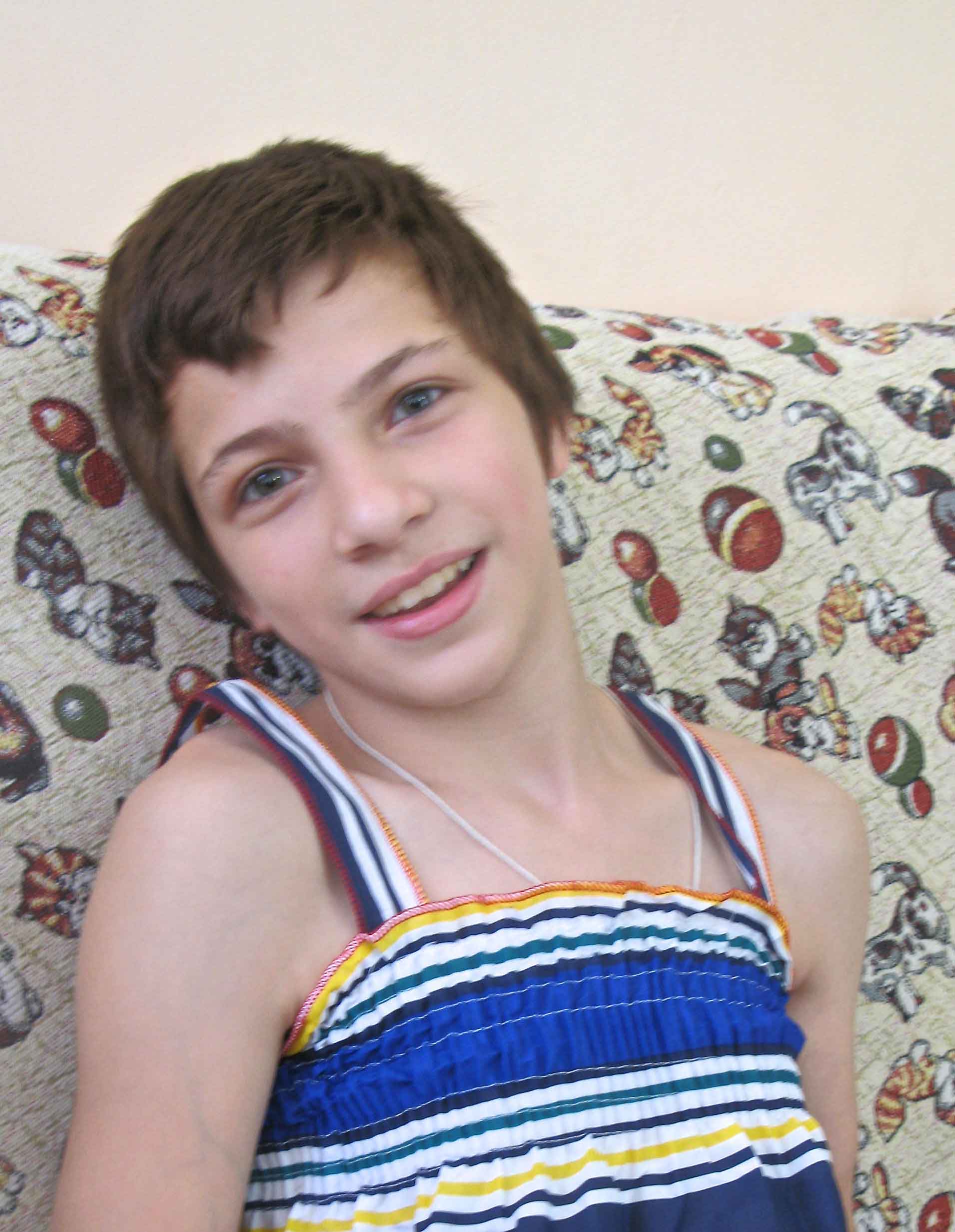 Лизе – одиннадцать лет. У нее ДЦП. Но заболевание не мешает ей принимать активное участие в играх и творческих мероприятиях детского дома. Лиза любит рисовать и смотреть телепередачи о моде. Очень самостоятельная, помогает воспитателям. Елизавета надеется: у нее когда-нибудь появится настоящая семья с папой и мамой, братьями и сестрами...