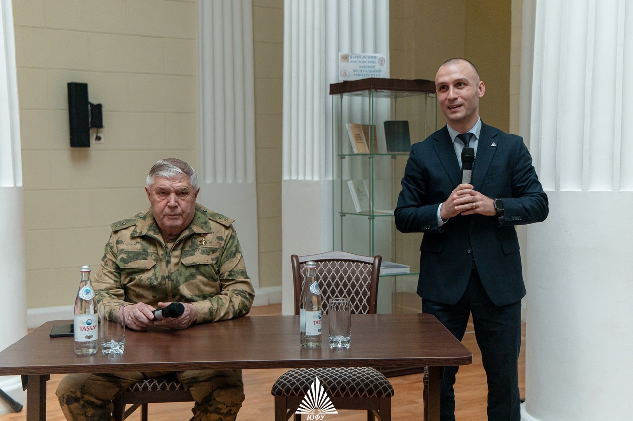 Генерал-лейтенант, Герой России Григорий Константинович Хоперсков традицию Уроков Мужества продолжает уже более десяти лет. Недавно он встречался с юнармейцами, участниками движения Первых из нескольких школ Веселовского района. Ранее общался с финалистами проводимого «Нашим временем» конкурса школьных музеев «Мы помним». Теперь вот встретился со студентами ЮФУ.