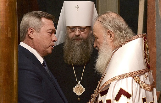 На снимке: донской губернатор В. Голубев, архиепископ Ростовский и Новочеркасский Меркурий и патриарх Кирилл.