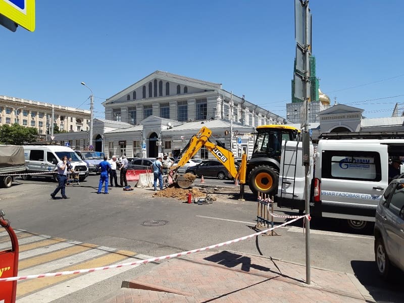 Сегодня утром в Ростове в районе Центрального рынка на проезжей части на пересечении проспекта Буденновского и улицы Обороны повредили газовую трубу при проведении ремонтных работ.