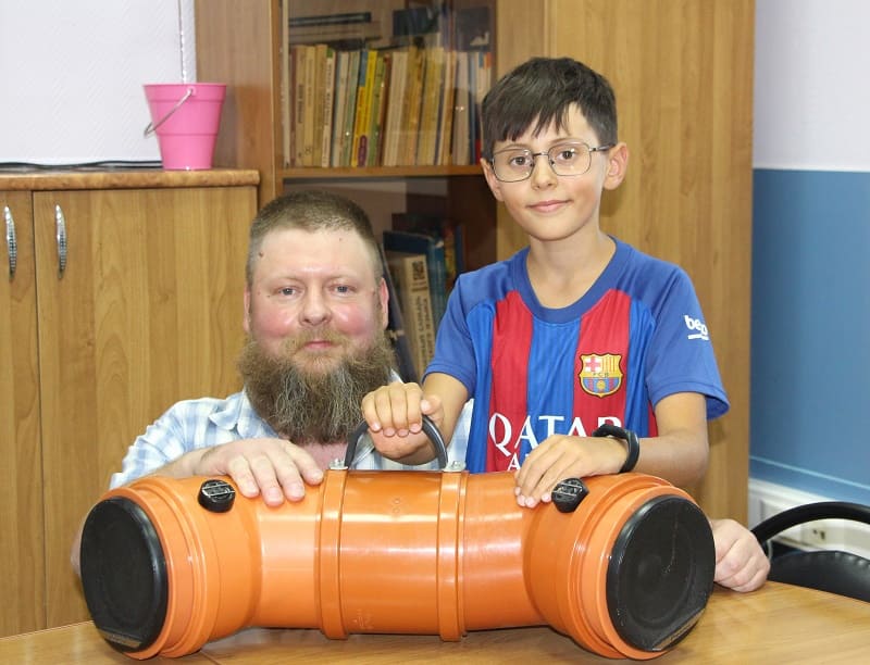 Одна из самых неожиданных работ - аудиоколонка, корпусом для которой послужил кусок старой трубы. Ее автор - Владимир Скороходов. Он вместе с сыном буквально за два дня собрал аудиоколонку. Кроме отслуживший трубы для нее понадобились старые аккумуляторы от ноутбука, а некоторые детали Владимир специально заказывал в Китае.