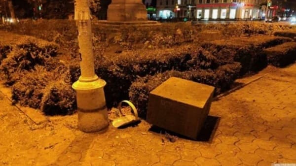 Вчера в сквере имени Платова в Новочеркасске местные жители обнаружили акт вандализма: с постамента был скинут каменный куб, установленный на месте захоронения группы продработников, «погибших от рук кулацких бандитов 21 февраля 1921 года». Этот памятник был частью мемориального комплекса, расположенного в сквере: рядом находится такой же куб в честь погибших воинов Красной армии во времена Великой Отечественной войны. В советские времена между кубами находился памятник Ленину, сейчас — Платову.