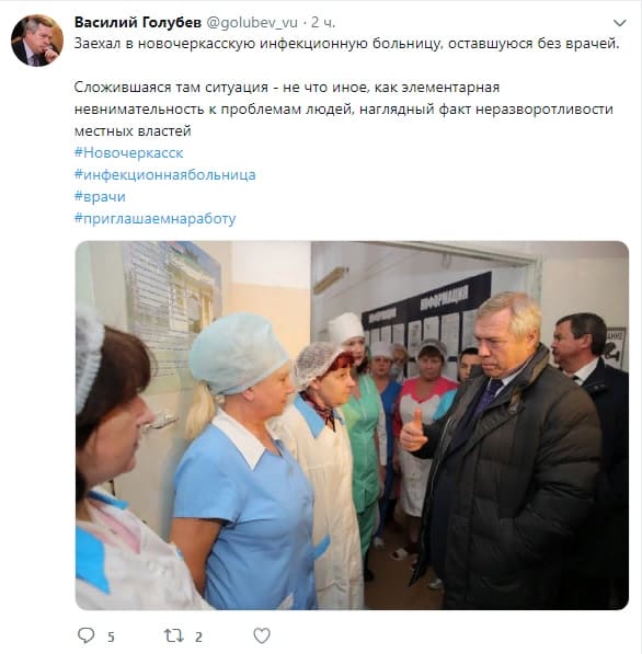 Донской губернатор Василий Голубев посетил инфекционную больницу Новочеркасска. О своих впечатлениях от поездки он поделился в Твиттере.