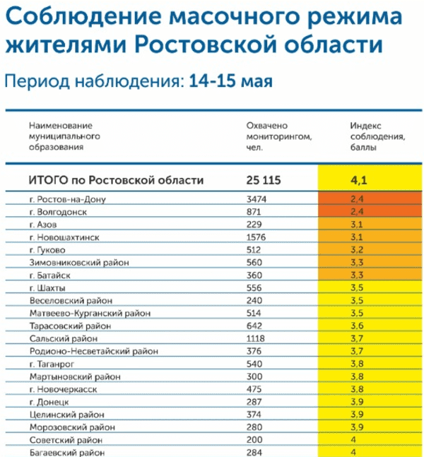 Сегодня поступили первые данные такого мониторинга: лучше всех соблюдают масочный режим в Каменск-Шахтинском и Чертковском районе — жители получили от наблюдателей 4,9 баллов из 5. А вот «двоечниками» оказались Ростов-на-Дону и Волгодонск — ношение масок жителями этих городов оценивается в 2,4 балла.