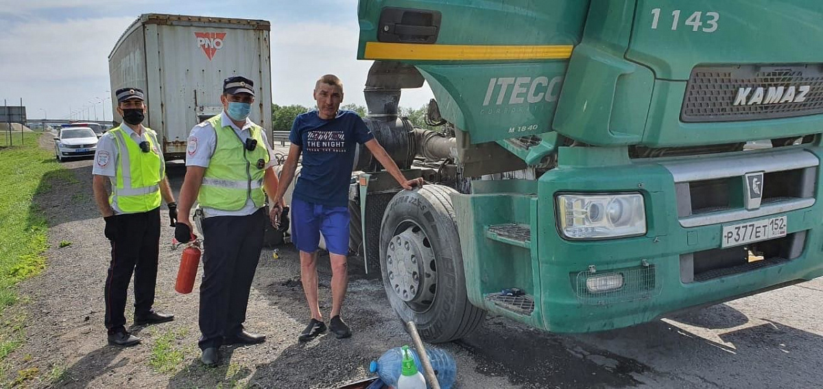 Во время патрулирования старший лейтенант Юрий Кравцов и лейтенант Михаил Корсунов увидели, как на обочине водитель самостоятельно пытается потушить дымящийся КАМАЗ. Автоинспекторы пришли ему на помощь. Пока водитель и один инспектор занимались непосредственным тушением, второй инспектор остановил попутный автомобиль с просьбой водителя о помощи. Они отсоединили прицеп с грузом стоимостью около 70 миллионов рублей.