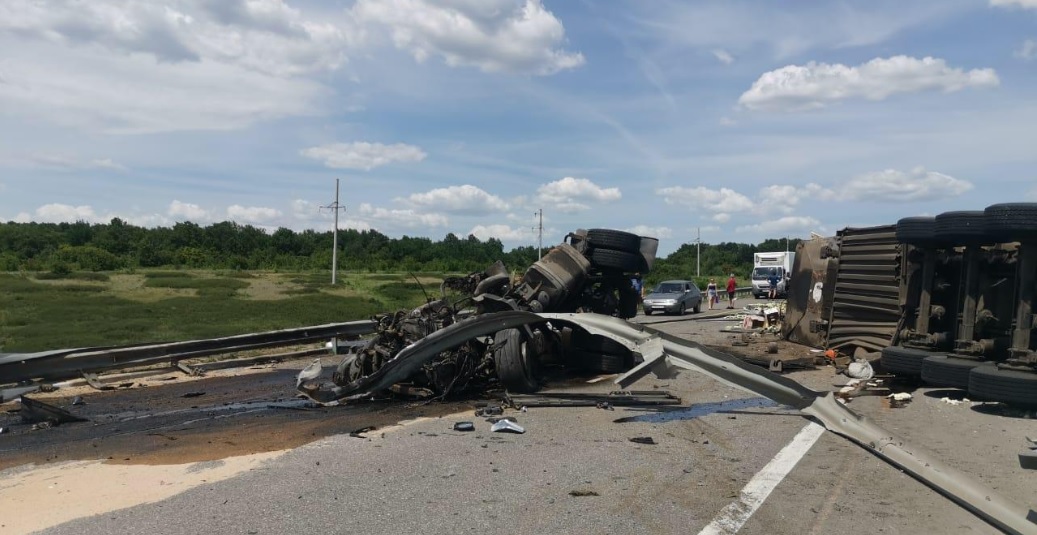 По предварительным данным, водитель Volvo FH 12 не справился с управлением и по касательной въехал в Ниву. Затем большегруз снес разделительный отбойник и выехал на встречную полосу, где столкнулся с двумя МАЗами и в итоге перевернулся.