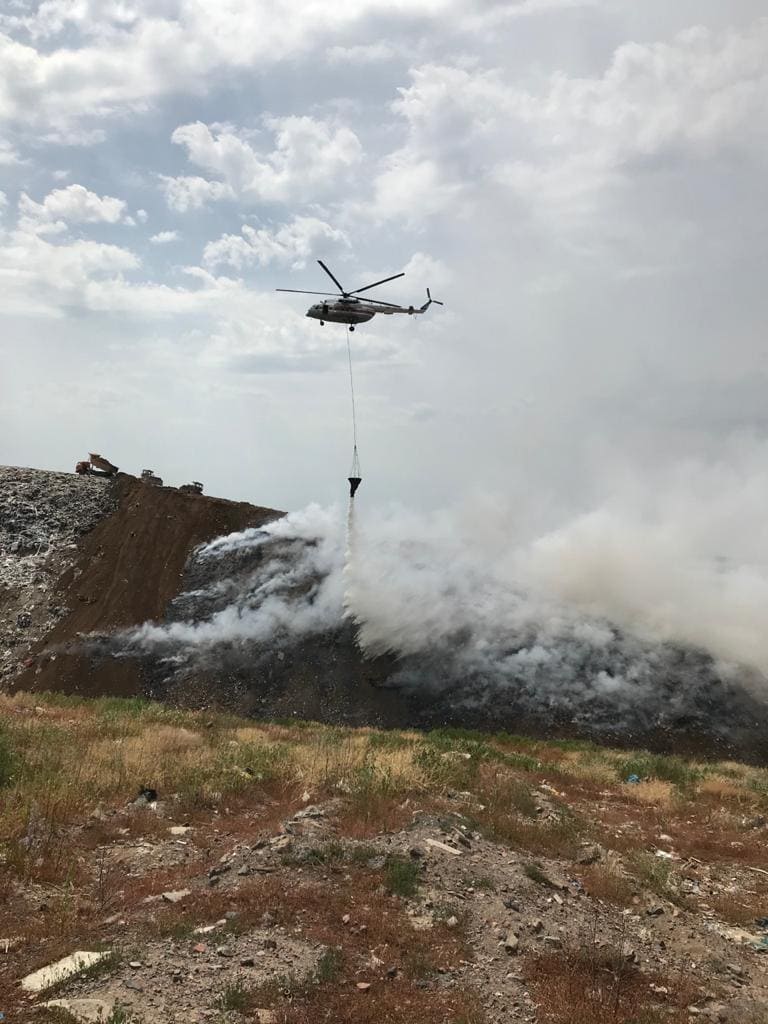 В настоящее время площадь полигона, объятая огнем, уточняется. К работам по тушению пожара привлечен вертолет пожарной авиации.