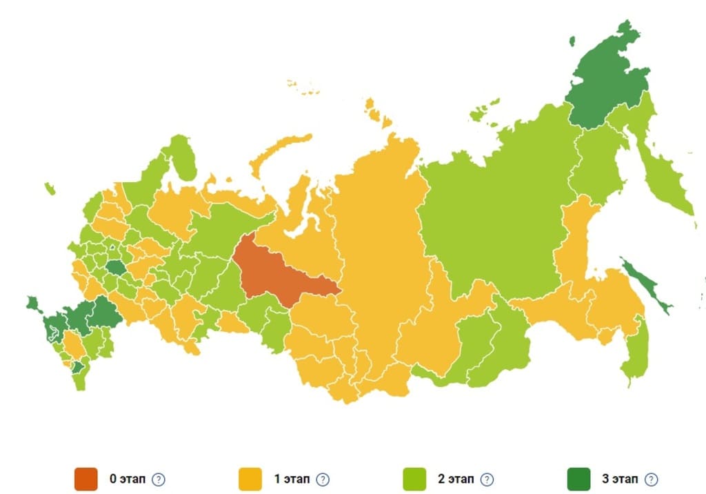 На данный момент на последнем этапе отмены ограничений находятся 10 регионов России, включая Ростовскую область (по данным федерального Стопкоронавирус.рф). Находящихся на первом и втором этапах выхода из самоизоляции примерно одинаковое количество субъектов Российской Федерации. Не преступили к снятию ограничительных мер только в Ханты-Мансийском автономном округе.