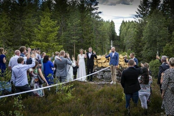 Свадьба между гражданами Норвегии и Швеции в условиях пандемии. Ленточка — реальная граница между странами.