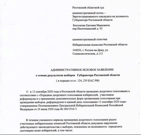 Как видно, Бессонов воспользовался своим правом оспорить результаты выборов через суд. В прикрепленном скане заявления значится, что его заявление было принято в областном суде Ростовской области 14 сентября в 18:16.