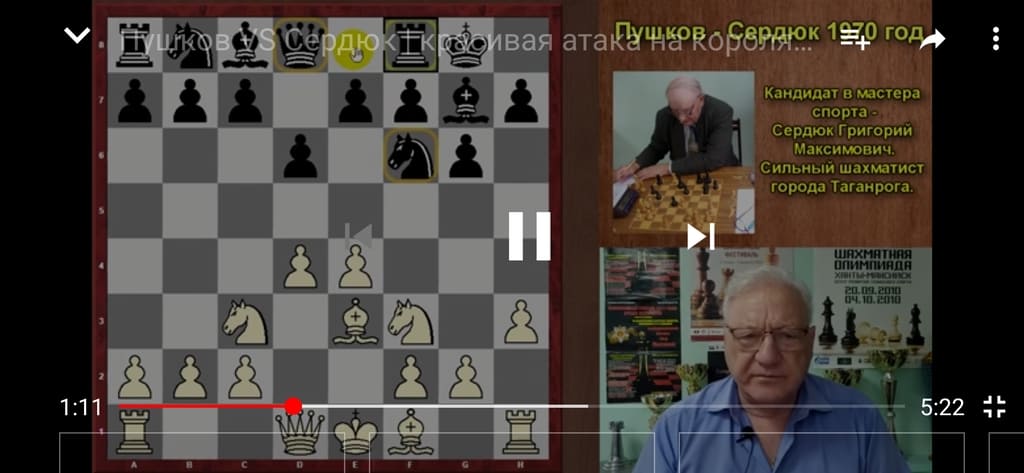 И вот новый видеофильм увидел свет. Николай Викторович показал в нем партию, сыгранную в 1970 году в финале чемпионата Ростовской области против кандидата в мастера спорта из Таганрога Григория Сердюка. В этой партии белые провели красивую атаку, которая принесла им достаточно быструю победу..