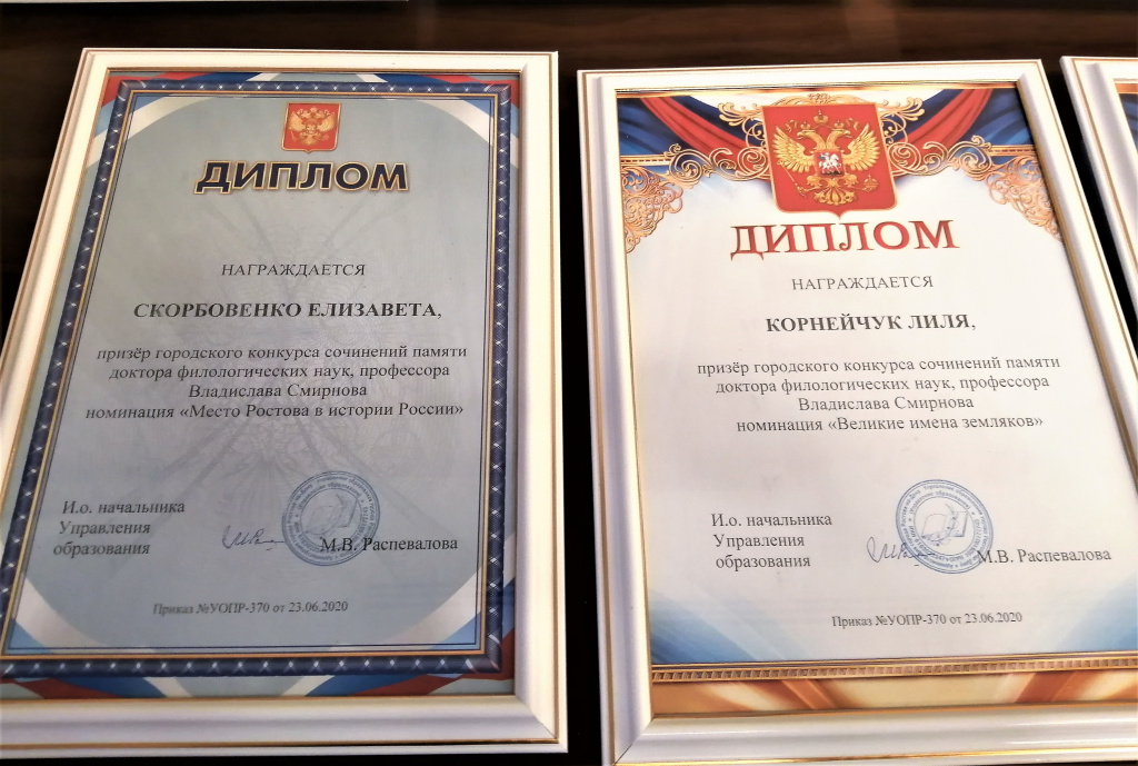 Всего на конкурс были представлены порядка ста работ. Они оценивались по номинациям «За что я люблю Ростов?», «Великие имена земляков. Ростовцев. Ростовчан», «Место Ростова в истории России». Назовем победителей и призеров. Нам это тем более приятно сделать, что среди лауреатов были и представители школ, отмеченных жюри другого конкурса - «Мы помним», проведенного «Нашим временем» при поддержке Минобразования.