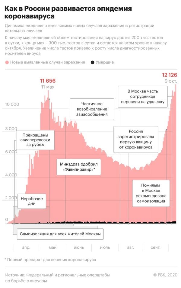 - В России третий день подряд зафиксировали рекордные приросты новых случаев заражения коронавирусом с начала пандемии в стране. По мнению экспертов Минздрава РФ, ближайшая неделя в нашей стране может стать критической, после чего мы уже может выйти на новое плато. Ориентировочно, новый стабильный уровень прироста новых случаев COVID-19, в зависимости от соблюдения россиянами ограничительных мер, будет в 17-23 тысячи зараженных коронавирусом в сутки. Ближе к декабрю надеются на спад, он должен совпасть с началом массовой вакцинации от коронавирусной инфекцией уже двумя российскими вакцинами. Новогодние праздники, возможно, мы будет отмечать при четкой тенденции к затуханию пандемии в стране.