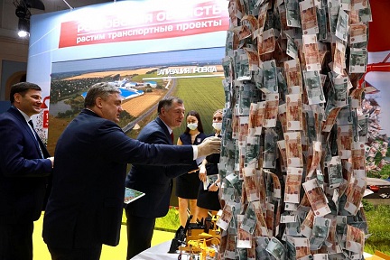 На снимке: во время посещения экспозиции Ростовской области вице-премьером Маратом Хуснуллиным (первый справа). Источник фото: ТРК "ДонТР"