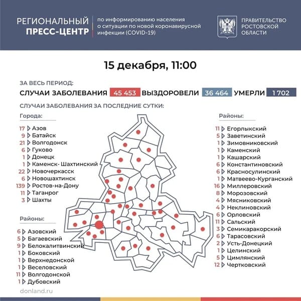 Однако лидерами по абсолютным показателям, на которые приходятся 59,6% всех новых случаев заражения коронавирусом нового типа, остаются Ростов-на-Дону, Новочеркасск, Батайск, Таганрог и Каменск-Шахтинский, районы Сальский, Миллеровский, Неклиновский и Белокалитвинский районы.
