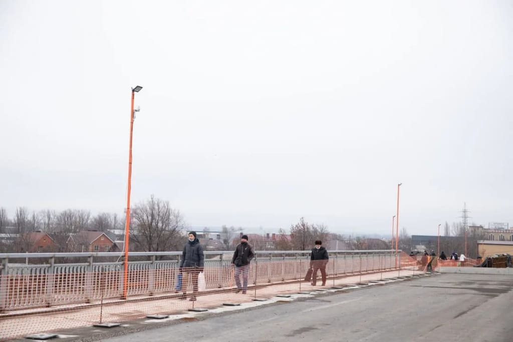 Напомним, что хоть движение транспорта по мосту и перекрыто, но путепровод пешеходы могут пересечь по выделенному участку нового моста. Для этого его часть огородили и провели освещение.
